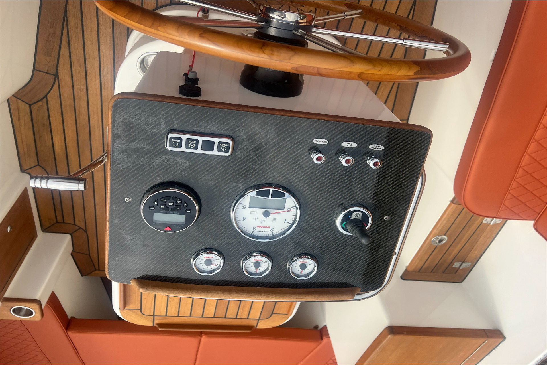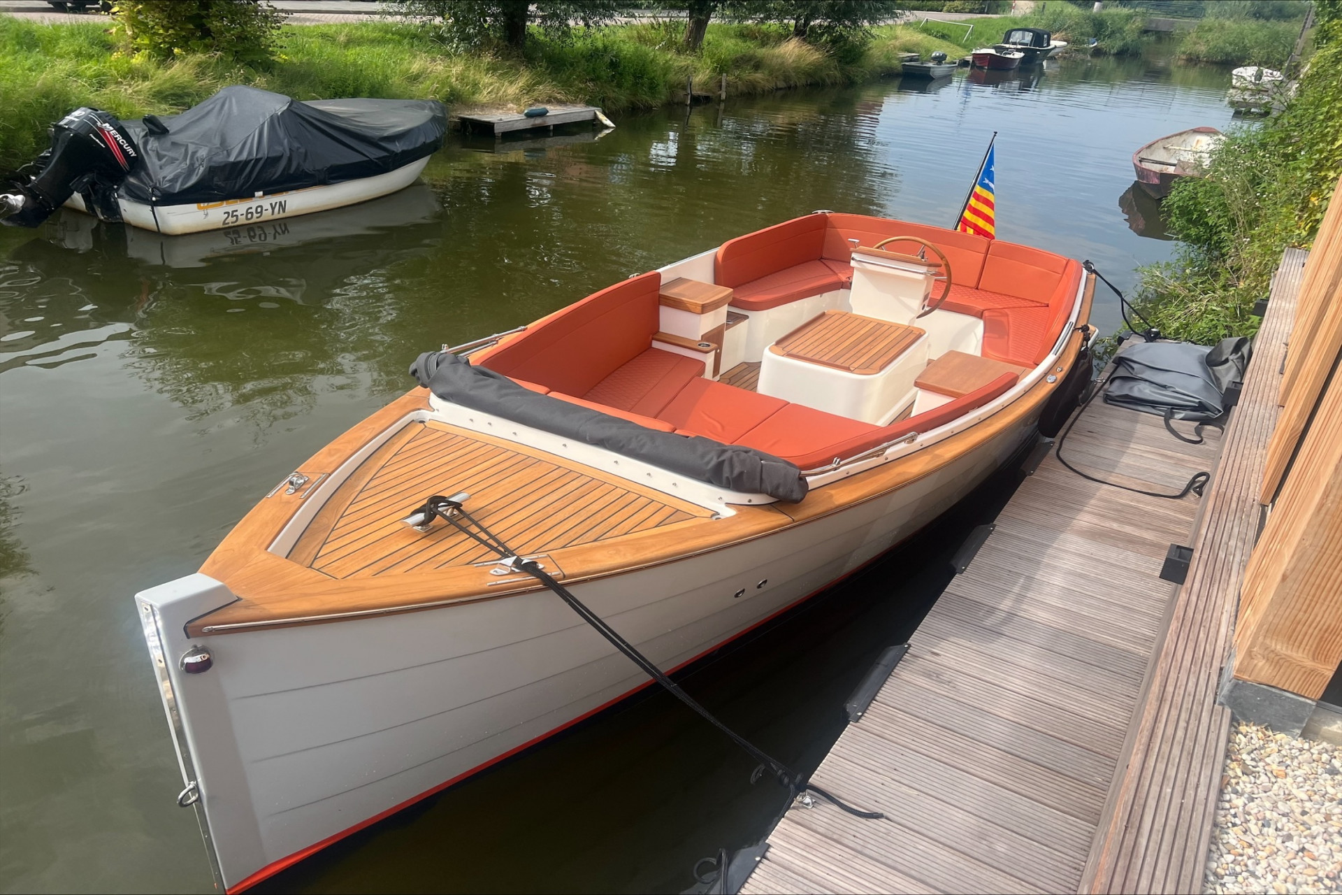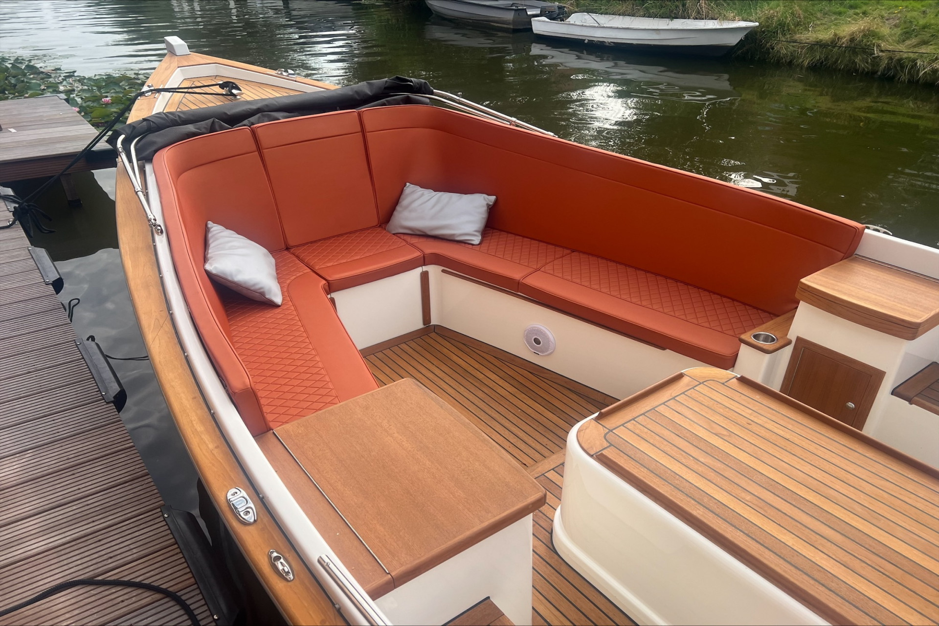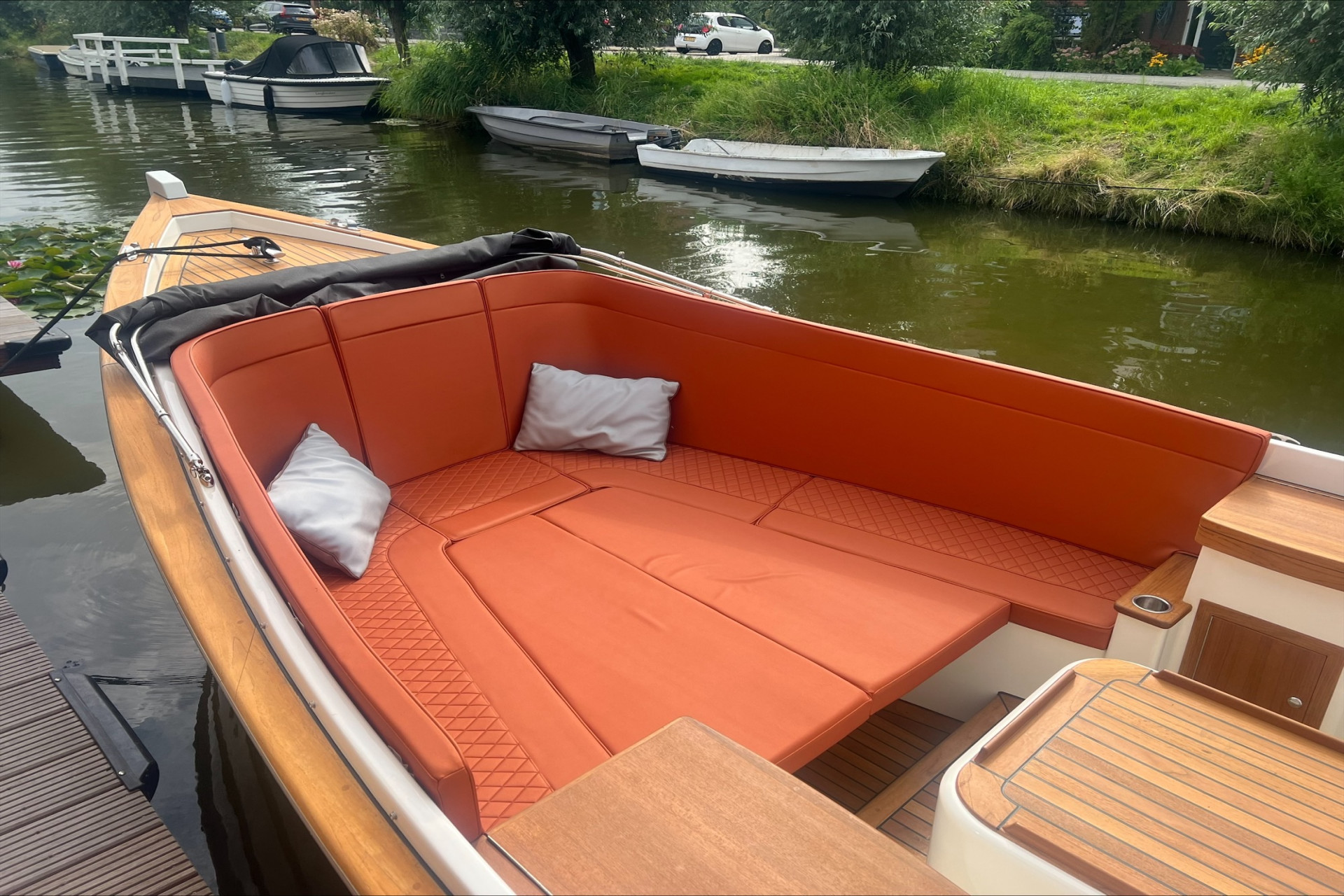 Luxe dashboard met losse meters en schakelaars Massief RVS strip op potdeksel Stuurwiel Teak 60cm i.p.v. standaard 50cm Extra accu met gescheiden laadsysteem Walstroom aansluiting met acculader en snoer USB of 12 Volt aansluiting per stuk Waterlijn