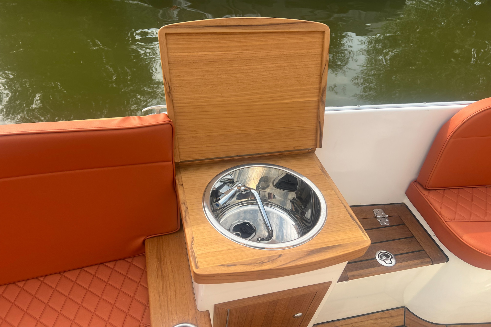 Massief teakhouten vloer met lijfhout Massief teakhout op voordek en zwemplateau Massief teakhouten armleuning met rvs bekerhouder