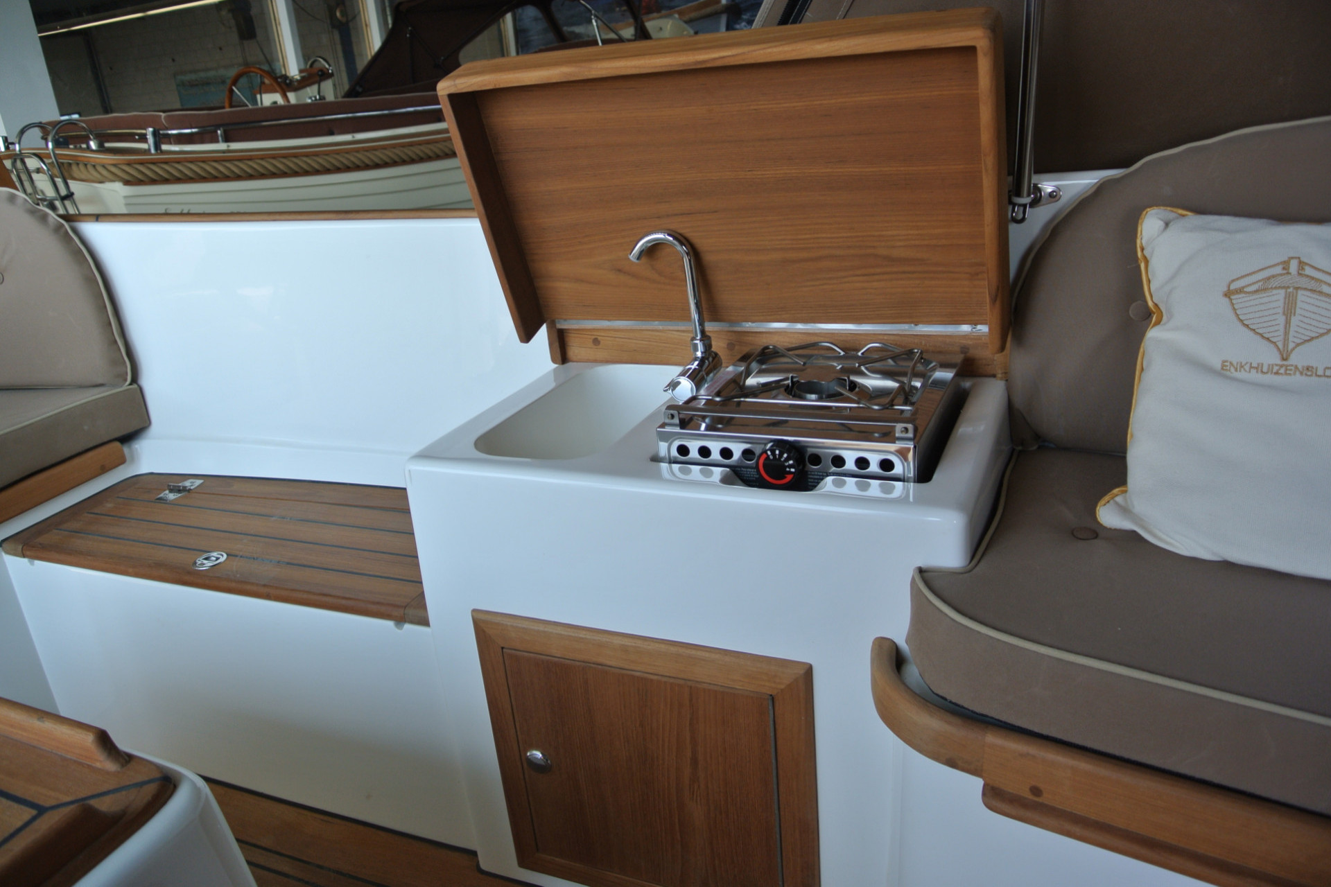 Massief teakhout op voor- en achterdek € 3250,=