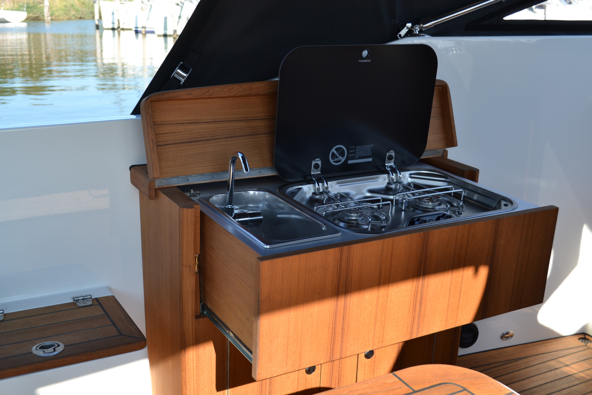 Centraal geplaatste 2-pits kookplaat excl. gasfles, RVS wasbak, 40 liter tank € 3200,=