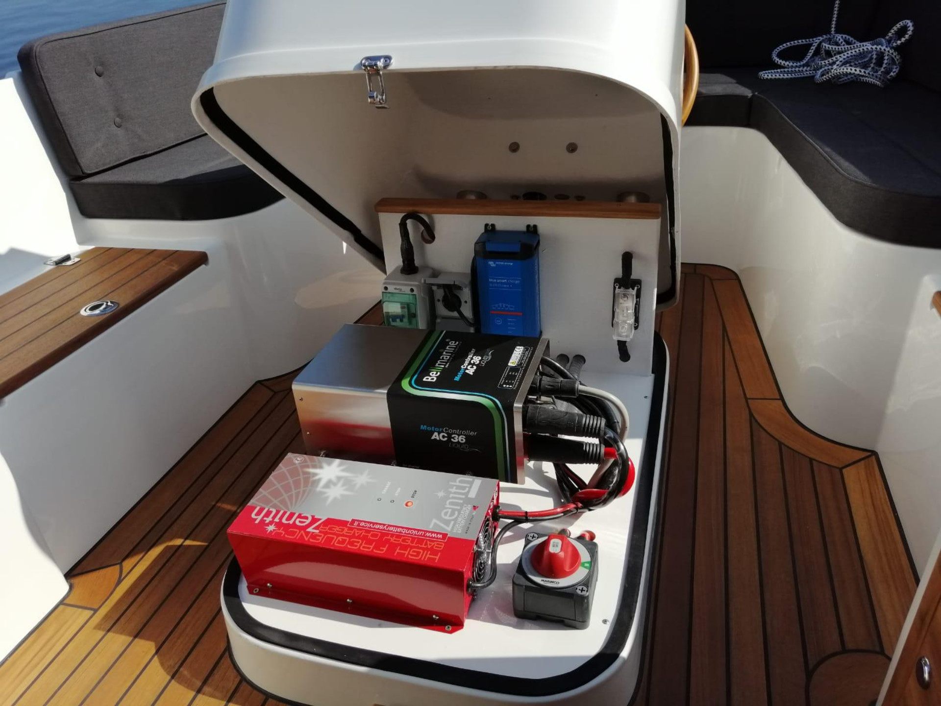 Aangehangen roer met teakhouten wangenTeakhout op de motorkast